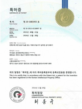 특허증(초미세먼지제거및살균기능을 갖춘 4계절용 공기조화기)